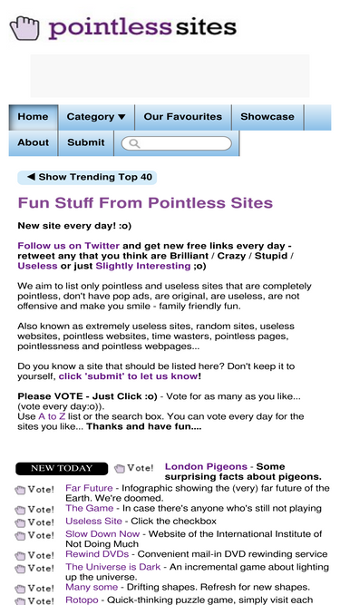 100%are you bored? want something fun to do? check out these funny websites, pointless facts and stupid pictures brought to you by pointless sites!