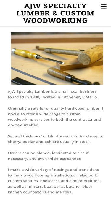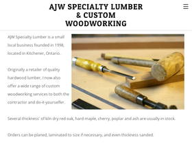 92%AJW Specialty Lumber is located in Kitchener, Ontario. Services include planing, sanding, lumber retail and custom woodworking like flooring reducers, butcher block countertops, porch columns for heritage homes, built-ins as well as mantles.