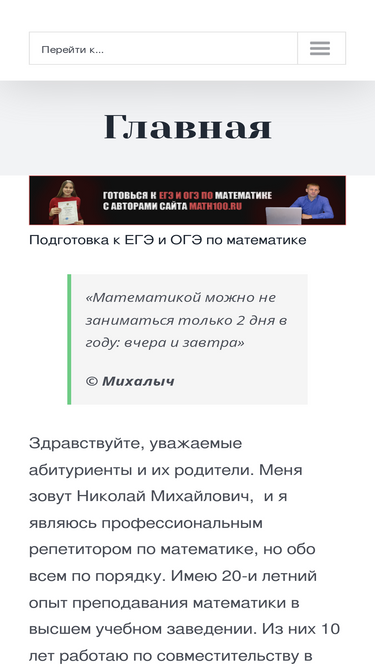 88%Подготовка к ЕГЭ и ОГЭ по математике "Математикой можно не заниматься только 2 дня в году: вчера и завтра" © Михалыч Здравствуйте, уважаемые абитуриенты и их родители. Меня зовут Николай Михайлович, и я являюсь профессиональным репетитором по математике, но обо всем по порядку. Имею 23-летний
