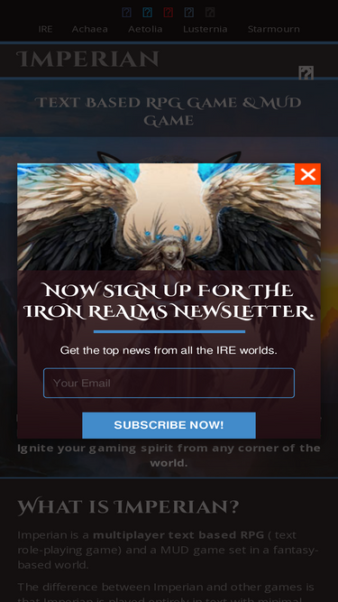 90%Imperian is a Free to Play, MMO, text game you can play directly in your browser or mobile device. Create a character from a dozen different races, select from 20 different classes, and find adventure while playing with other people from all over the world.