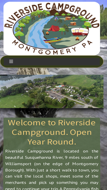 riverside campground is located on the beautiful susquehanna river, 9 miles south of williamsport, pennsylvania. the campground is open year round with both campsites and cabin rentals.