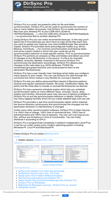 87%dirsync pro: powerfull synchronization and backup utility. it's portable, easy to use, open source, 100% free, 100% spyware-free, no limitations