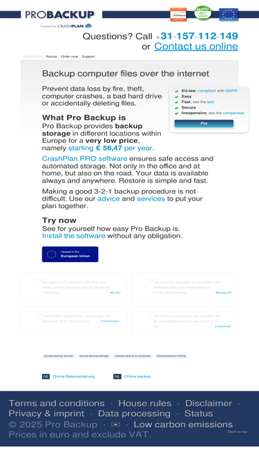 47%pro backup is an online backup service for business with a very low price (50gb backup space € 4,71/month), free 14 day trial, friendly software for windows, mac os x, linux and solaris.