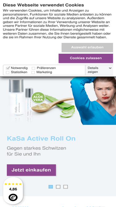 Das Antitranspirant gegen starkes Schwitzen Auch wenn nicht viele Menschen gerne darüber sprechen, kennen dennoch sehr viele dieses Problem: Die Temperaturen steigen oder es reichen auch nur ein paar Bewegungen aus und die ersten sichtbaren Schweißränder zeichnen sich an T-Shirts und Hemden ab, die man nach kurzer Zeit schon wieder wechseln könnte. Schon der Gedanke daran zu schwitzen reicht oft aus. Nun gibt es endlich ein Deo, das dieses Problem behebt, Ihnen Ihre Lebensqualität zurück gibt. KaSa Deo ist gegen starkes Schwitzen – Schweiß und Schweißgeruch stellen jetzt kein Problem mehr für Sie dar. Informieren Sie sich auch über unsere Produkte gegen Fußschweiß und gegen Achselschweiß. Ergiebig: reicht für eine Anwendung von ca. 6 Monaten! NEU: Anwendungsbereiche am gesamten Körper: unsere Produkte sind dermatologisch geprüft und sie können unsere Produkte gegen starkes Schwitzen überall dort einsetzen, wo Nässe auftritt! Dazu zählen auch Achseln, Stirn, Brust, Gesicht, Kniekehlen sowie der Intimbereich. Der Klassiker gegen Schwitzen – das Antitranspirant im 50ml Flakon Da wir zu 100% von unserem Produkt überzeugt sind, geben wir Ihnen eine 50 Tage Geld-zurück-Garantie. Sollten Sie mit unserem Produkt nicht vollständig zufrieden sein, schreiben sie uns bitte an, damit wir Ihnen den Retoureschein zusenden können. Packen Sie anschließend das Antitranspirant gegen Schwitzen einfach wieder in seine Verpackung und schicken es zurück. Wenn sie weitere Fragen zu unseren Produkten oder der Anwendung haben, schauen sie auf unserer Fragen-Antworten-Seite vorbei. Hier werden die häufigsten Fragen kompetent für sie beantwortet. Sollte dennoch etwas unklar bleiben, zögern sie nicht uns zu kontaktieren. Was ist KaSa? KaSa Deo ist eine hochwertiges, kosmetisches Qualitätsprodukt!Eine Flasche umfasst 50 ml und reicht für ca. 6 Monate. KaSa Deo ist überall da einsetzbar, wo unerwünschte "Nässe" (durch Schwitzen, Schweiß) an den Problemzonen auftaucht. Zudem wird KaSa Deo