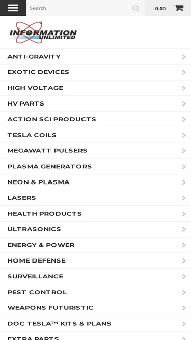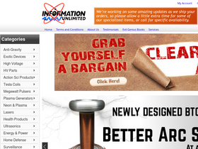 information unlimited, science projects, tesla, tesla coils, high voltage engineering, high voltage power supplies, marx generator, plasma globe, anti gravity, security devices, ultrasonics, hypnotism, mind control, electronic kits, plans, books, videos, pyrotechnics, neon, neon power supplies, neon transformers