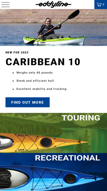 71%The Caribbean 100 is a sleek, lightweight sit-on-top kayak designed for easy transport, storage, and solo handling. At just 40 pounds, it delivers excellent stability, tracking, and maneuverability in a compact 10-foot package. Outfitted with a raised, removable seat, gear tracks, hatches, and scuppers, the Caribbean 100 is a versatile performer that’s as comfortable as it is capable. A removable seat with marine-grade foam and UV-resistant mesh fabric seat clips into place in seconds, giving it excellent comfort and durability An 8" bow hatch and a 5.25" quarter-turn tankwell hatch provide easy access to most of the interior space. The cockpit features adjustable foot braces, a 6" accessory gear track, and a self-draining seat pan. Bow and stern webbing carry handles provide comfort for straightforward two-person handling, while perfectly balanced side carry handles make it easy for solo handling. The side handles also double as one-handed paddle holders. The raised seat provides good visibility and a dry ride, while the four scuppers allow for effective drainage of the cockpit and tank well. A stern drain plug allows for easy drainage of the interior space if needed. Not sure which kayak is right for you? Visit our 'Choosing an Eddyline' blog series to find your perfect match.' Looking for parts and accessories for this kayak? Click here to explore more. https://cdn.shopify.com/s/files/1/0284/7725/9864/files/eddyline-caribbean-100-sit-on-top-kayak-features.jpg?v=1756510434 Inshore, Lakes and Ponds, Fishing, Rivers and Creeks (Class I-II)| Weight Capacity: 200 lbs. / 91 kg, Paddler Size: S/M, Length: 10' / 305 cm, Width (Beam): 29" / 74 cm, Weight: 40 lbs. / 18 kg, Hatches: 2
