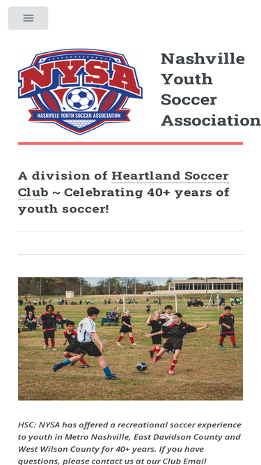 93%nashville youth soccer association (nysa) is a co-ed youth recreational soccer league for players ages 3 to 18. there are no tryouts and children are accepted regardless of whether they've played soccer before or not. nysa has been providing a quality soccer experience in the nashville, tn area for more than 35 years.