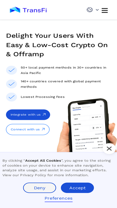 82%Updated January’23 The Terms & Conditions and any terms and conditions incorporated herein by reference (collectively, the “Terms & Conditions”) govern user’s use of www.transfi.com website (the “Website”), any mobile device applications made available to user by Trans-Fi Inc. & Trans-Fi UAB company and any of its subsidiaries & associates (the “Company,” “we,” or “TransFi”), and any other services made available to user by us, including any software interface that enables user to (a) purchase or sell Digital Assets (“Digital Assets” or “DA”) which includes but not limited to Digital Assets, Digital tokens, NFTs etc., for userself through the company or any one of our third-party service providers, either using fiat denominated funds or other forms of Digital Assets and (b) online storage or transfer of Digital Assets owned by the Users. By accessing, browsing or otherwise using the Services, by becoming a User with us or by clicking “Agree” when prompted to do so on the website, the user agrees that the user has read, understood and accepted all of the Terms and our Privacy Policy (the “Privacy Policy”), which is incorporated by reference into the Terms & Conditions.