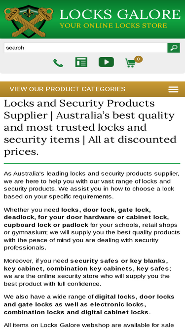 as australia's leading locks and security products supplier, we are here to help you with our vast range of locks and security products. we assist you in how to choose a lock based on your specific requirements. whether you need door lock, gate lock, deadlock, for your door hardware or cabinet lock, cupboard lock or padlock for your schools, retail shops or gymnasium; we will supply you the best quality products with the peace of mind you are dealing with security professionals. moreover, if you need security safes or key blanks, key cabinet, key safes; we are the online security store who will supply you the best product with full confidence. we also have a wide range of digital locks, door locks and gate locks as well as electronic locks, combination locks and digital cabinet locks. all items on locks galore webshop are available for sale direct to the public, at the discounted online prices. our physical store is at f1-12 viewtech place, rowville, vic 3178, australia.