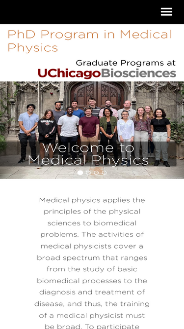 55%the university of chicago's graduate program in medical physics is a joint program of the departments of radiology and radiation oncology which leads to an s.m. or ph.d. degree. the faculty in the program are recognized internationally for their research excellence.