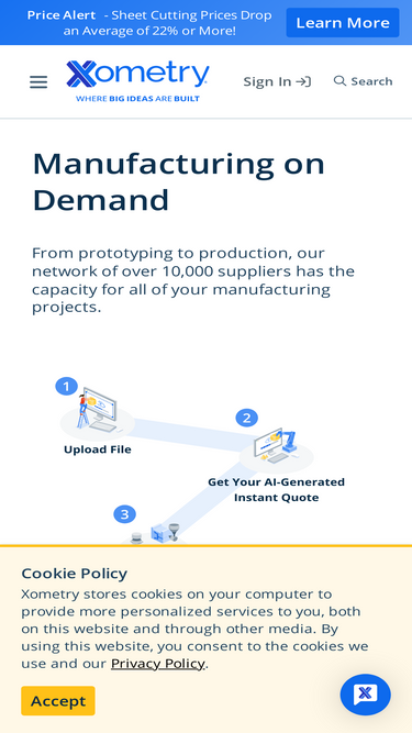 85%xometry is the leader in high precision manufacturing on demand for prototypes and production parts. get an instant quote on cnc machining, 3d printing, injection molding, sheet metal fabrication and more. hundreds of materials and post-processing options so your parts are ready to use the first time.