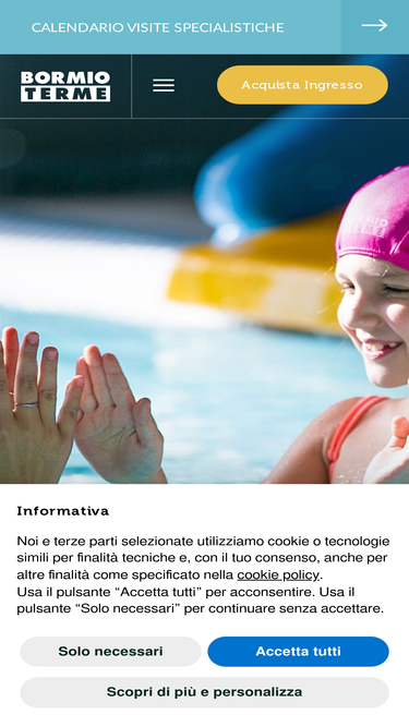 71%Se desideri acquistare o regalare un ingresso a Bormio Terme puoi trovare l'opzione che più rispecchia le tue esigenze, tra ingressi singoli, per famiglie, giornalieri o 2 ore e mezza. --INTRO-- Acquista o regala un ingresso a Bormio Terme. Sono due le possibilità per vivere al meglio il percorso Benessere di Bormio Terme: ingresso g