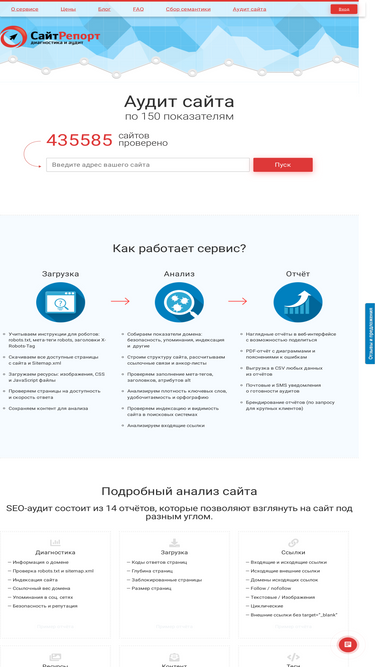 70%анализ сайта по 150 параметрам. бесплатный аудит до 25 страниц. удобные отчеты, рекомендации сразу после проверки.