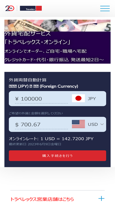 95%お得な外貨両替、外貨宅配ならトラベレックス。米ドル、ユーロ、中国元等31種類の通貨をお取扱いしています。外貨両替・外貨宅配サービスをオンラインでご利用いただけます。また、北海道から沖縄まで主要空港、街中で外貨両替ショップも運営しています。