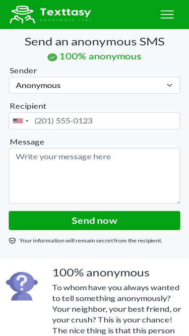 74%send anonymous text with texttasy. send anyone a message without your name being attached to it. send anonymous sms easily and fast.