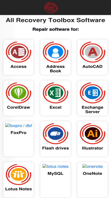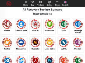 74%recovery tools for corrupted files of outlook, outlook express, windows address book, zip, rar, excel, word, access, powerpoint, project, onenote, flash, cd, dbf, pdf, sql, server, mysql, registry, photoshop, illustrator, exchange server, autocad, coreldraw, lotus notes.