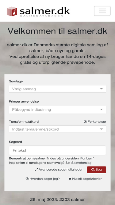 99%søg blandt tusindvis af salmer. lige fra salmebogens gamle salmer til de mange nye gode salmer