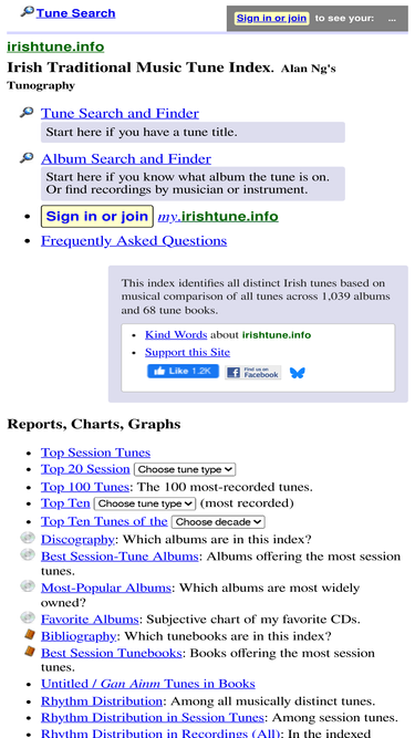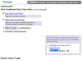 83%expert-verified index of over 7,000 traditional irish tunes. includes alternate titles, exact locations of the tune on cds and in tunebooks, tune publication histories, top session tunes, and statistics.
