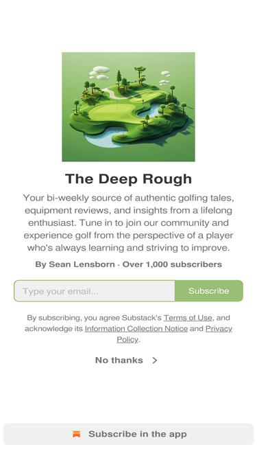 88%Your bi-weekly source of authentic golfing tales, equipment reviews, and insights from a lifelong enthusiast. Tune in to join our community and experience golf from the perspective of a player who's always learning and striving to improve. Click to read The Deep Rough, by Sean Lensborn, a Substack publication with thousands of subscribers.