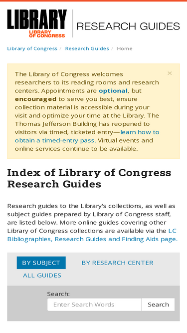 74%Index of Library of Congress Research Guides Research guides to the Library's collections, as well as subject guides prepared by Library of Congress staff, are listed below. More online guides covering other Library of Congress collections are available via the