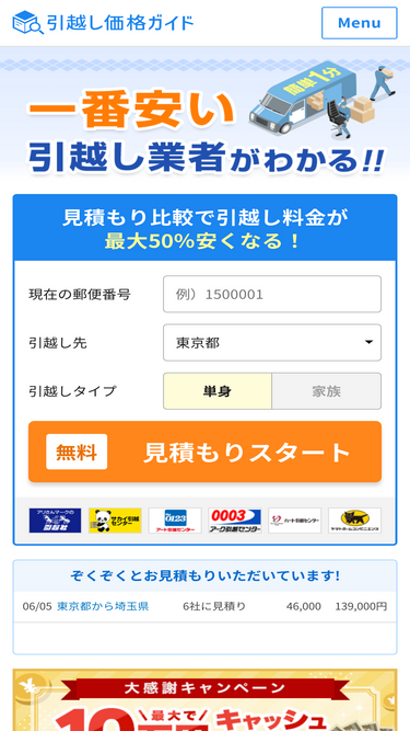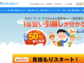 93%300社以上の引っ越し業者に見積もり依頼&引っ越し予約ができる無料の一括見積もり比較サイト!相見積もりで引っ越し価格が一番安い業者が見つかる!引越し業者のメタサーチなら引越し価格ガイドにお任せ。料金相場や費用を安くする方法、荷造りや手続きなど、初めての引っ越しにおすすめのお役立ち情報も掲載中!