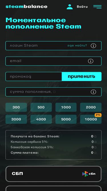 96%Моментальное пополнение баланса STEAM с минимальной комиссией и удобными способами оплаты