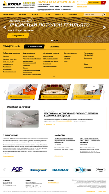 96%компания булар осуществляет дизайн-проект, продажу и монтаж подвесных потолков всех типов реечных, грильято, акустических, армстронг, медицинских, дизайнерских, кассетные, кубота, жалюзи, соло, а так же светодиодных светильников, акустических стеновых панелей таких производителей как экофон, армстронг, рокфон, кнауф, гиптон, цесал, номифон, geipel, эра, албес, парафон. узнать цену и купить можно со склада в спб с доставкой по всей россии