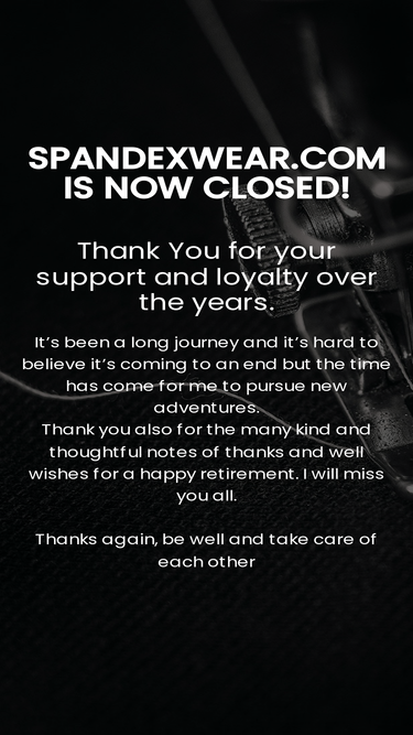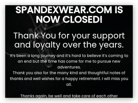 93%Welcome to Spandexwear.com! Thank You to everyone who has ordered over the years- including some have been here from the very beginning! It’s been a long journey and it’s hard to believe it’s coming to an end. Thank you also for the many notes of thanks and well wishes for a happy retirement