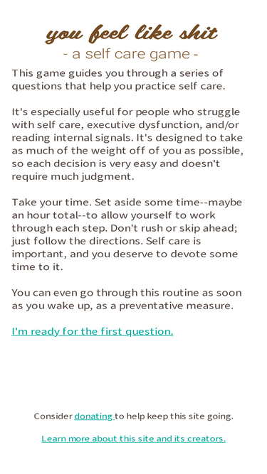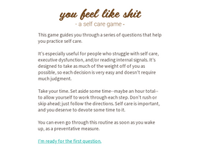 71%you feel like shit. that sucks. you feel like shit is a game designed to help you help yourself through your shitty times and practice self care.