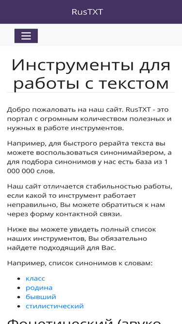 75%на сайте доступны словари синонимов, антонимов, толковый словарь русского языка. для редактирования текста можно использовать синонимайзер. анаграмма служит для составления слов из букв.