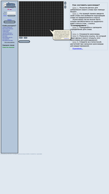 71%составьте кроссворд сами, набросав его мышкой и выбрав автоматически предложенные слова. ссылку на составленный кроссворд вы можете отправить друзьям для разгадывания. проявите эрудицию и юмор, выдумывая определения для слов. всё делается прямо онлайн! скачивать и регистрироваться не нужно.