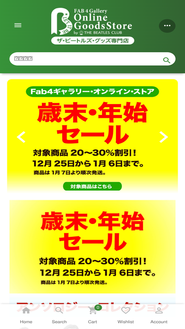 88%国内外のビートルズ・グッズを多数取り揃えてみなさまのアクセスをお待ちしています。ビートルズ・ファンが集まる憩いの場「FAB4ギャラリー レット・イット・ビー」が運営するオンライン・ストアです。