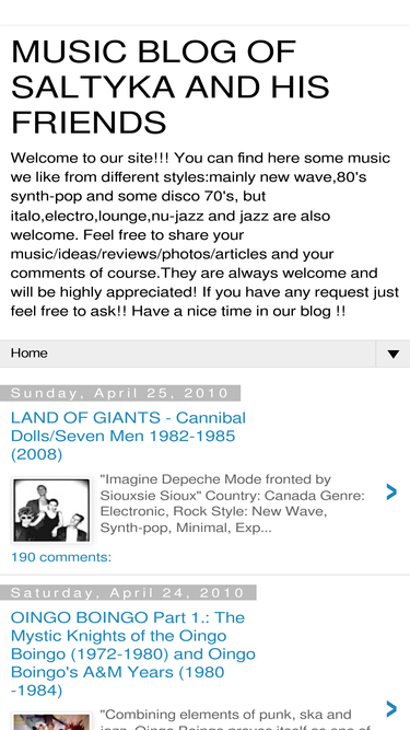 100%Welcome to our site!!! You can find here some music we like from different styles:mainly new wave,80's synth-pop and some disco 70's, but italo,electro,lounge,nu-jazz and jazz are also welcome. Feel free to share your music/ideas/reviews/photos/articles and your comments of course.They are always welcome and will be highly appreciated! If you have any request just feel free to ask!! Have a nice time in our blog !!