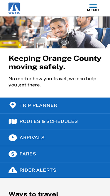 74%Since 1991 OCTA has kept residents and commuters moving throughout Orange County by bus, freeway, rail, bike, walking, and rideshare programs. Our projects and programs improve safety and efficiency on our local roads, provide bus service and regional multimodal connections, help people find ways to leave their cars home, and provide safe, convenient transportation to those with special needs.