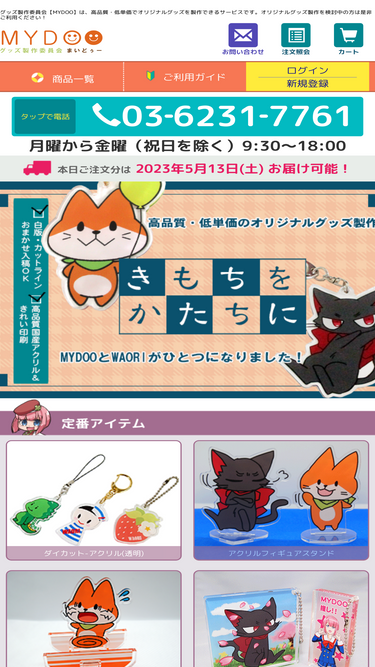 100%1個からオリジナルグッズが製作できる!どこよりも格安のオリジナルグッズ製作ならmydooにお任せください!アクキー、アクスタ、ボールペン、ストラップ、絵馬、缶バッジの実績多数!有名キャラクターグッズも多数製作。