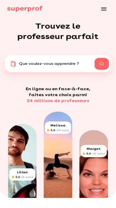 54%Trouvez votre professeur pour des cours particuliers ou collectifs parmi 1 000 000 profils. A domicile, chez le professeur, dans une salle dédiée ou même par webcam.