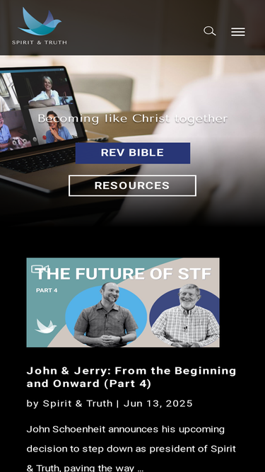 100%Becoming like Christ together REV BibleResources John & Jerry: From the Beginning and Onward (Part 4)by Spirit & Truth | Jun 13, 2025John Schoenheit announces his upcoming decision to step down as president of Spirit & Truth, paving the way ...WatchNo results found. John & Jerry: From the Beginning and Onward (Part 3)by Spirit &