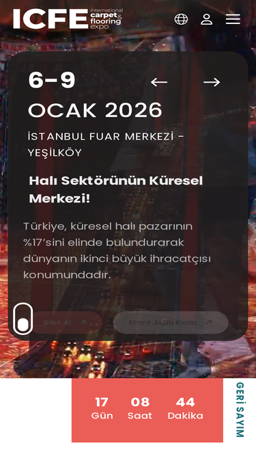 ICFE International Carpet and Flooring Expo. TÜYAP Tüm Fuarcılık Yapım A.Ş tarafından, İstanbul Halı İhracatçılar Birliği (İHİB) ve Güneydoğu Anadolu Halı İhracatçılar Birliği (GAHİB) işbirliği ile 6-9 Ocak 2026 tarihleri arasında, İstanbul Fuar Merkezi (İFM) Yeşilköy İstanbul’da düzenlenecektir.