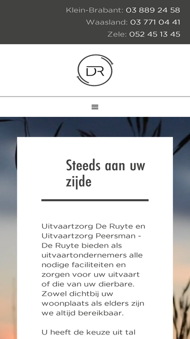 52%Uitvaartzorg De Ruyte is 24/7 bereikbaar via telefoon of e-mail. Contacteer ons gerust voor een afspraak in een van onze vestigingen of bij u thuis.