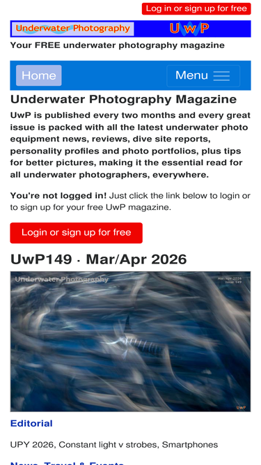 100%uwp is a free web magazine sponsored by advertising aiming to give a platform for existing and new talent in underwater photography together with equipment reviews. published continuously since 2001 uwp is a bi-monthly downloadable pdf file for you to keep and enjoy whenever it suits you.