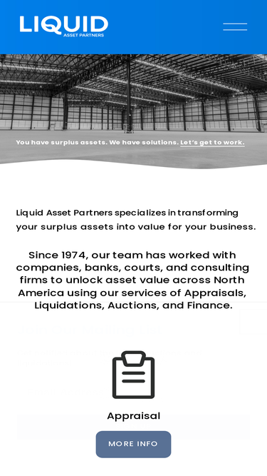Since 1974, our team has worked with companies, banks, courts, and consulting firms to unlock asset value across North America. We partner with clients to tailor a recovery plan for their needs using our primary services of Appraisals, Liquidations, Auctions, and Finance.