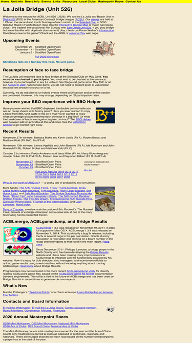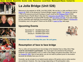 homepage for the la jolla unit 526 of the american contract bridge league (acbl). find upcoming events, game results, unit news and information, and more.