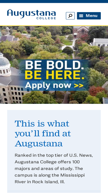 62%Augustana is a selective, private liberal arts and sciences college, founded in 1860 by Swedish settlers. The 115-acre wooded campus is in Rock Island, Illinois, on the Mississippi River.