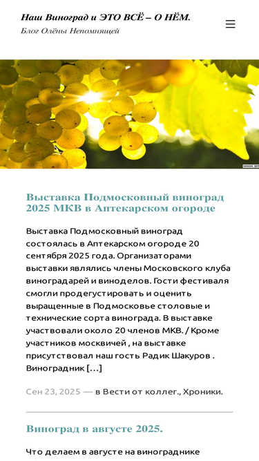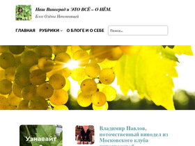 94%Олёна Непомнящая - это я, для юных коллег - Олёна Юрьевна. У моменту создания блога я уже 15 лет занималась любительским виноградарством, владею виноградником 160 лоз на севере Тверской области с коллекцией сортов плодового винограда. Стараюсь продвигать эту уникальную культуру на север, запад и восток, пишу статьи на темы виноградарства и виноделия.За эти годы нами испытано более 250 сортов, в основном винного (технического) и универсального назначения. На настоящий момент на нашем винограднике растет и испытывается 115 сортов. Районированные сорта винограда нашей коллекции пригодны для выращивания в Тверской области и в сопредельных регионах: в Подмосковье, в Новгородской, Вологодской, Псковской, Ивановской, Нижегородской и других областях центра, севера и северо-запада России, И я обязательно расскажу про сорта винограда нашей коллекции, сделав акцент на описании особенностей их выращивания. Очень хочется, чтобы наши знания и опыт не канули в никуда, а принесли пользу тем, кто пойдет за нами по виноградному пути. Для этого и создан Блог Олёны Непомнящей «Наш Виноград и это все -о нем».