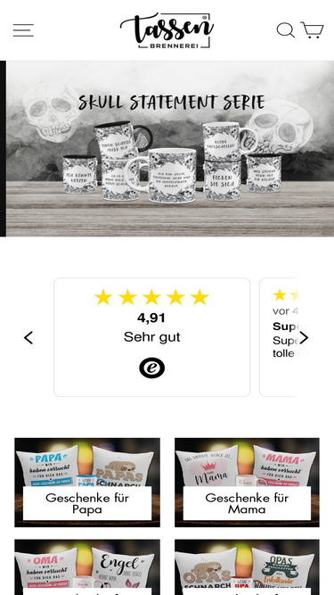 87%Die Tassenbrennerei versorgt Dich mit witzigen Geschenkartikel wie Kaffeetassen, Fußmatten oder Liebeskissen. Wir versenden generell Versandkostenfrei und bieten viele Zahlungsmöglichkeiten.