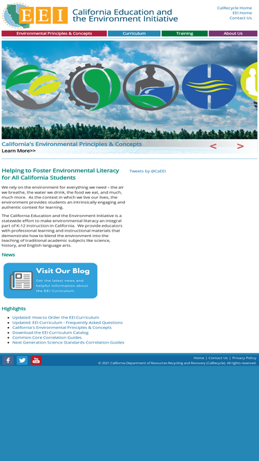 100%home page for the education and the environment initiative (eei) curriculum. includes a program overview and links to downloadable curriculum files and training opportunities for teachers.