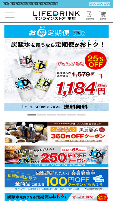 61%[LIFEDRINKオンラインストア]年間8億本を製造/販売する飲料メーカー ライフドリンク カンパニーのダイレクト通販サイトです。安全で、誰もがおいしいと感じられるお茶や炭酸水、ミネラルウォーターをお客様へお届けいたします。