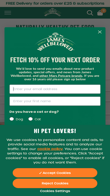 61%For over 30 years, James Wellbeloved has provided naturally hypoallergenic, nutritionally balanced, healthy ranges of dog & cat food made from selected natural ingredients. Puppy, Kitten, Adult & Senior recipes are all available. Free next day delivery, helpful staff, subscription plans & loyalty programmes.