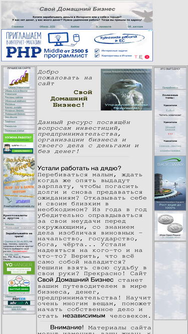 92%всё о бизнесе и инвестициях! как традиционном, так и в интернете. а также работа дома! от а до я. самые перспективные идеи бизнеса, актуальная информация, важные факты, новости из сферы предпринимательства, чужие ошибки (учимся), много полезных программ, книг и многое, многое другое. сайт рассчитан, как на новичков, желающих разобраться, что же такое бизнес и интернет бизнес в частности, так и на профессионалов, людей, ищущих новые идеи и новые возможности. узнайте, как заработать в интернете.