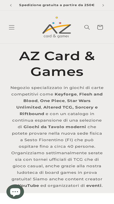 76%Negozio specializzato in giochi di carte competitivi come Keyforge, Flesh and Blood, One Piece, Star Wars Unlimited, Sorcery e con un catalogo in continua espansione di una selezione di Giochi da Tavolo moderni che potete provare nella sede fisica a Sesto Fiorentino (FI) che può ospitare fino a circa 50 persone.